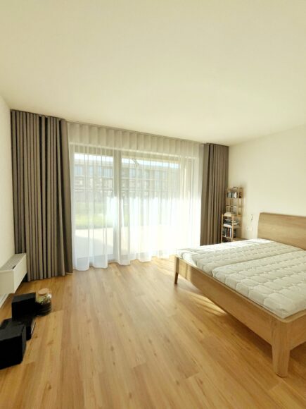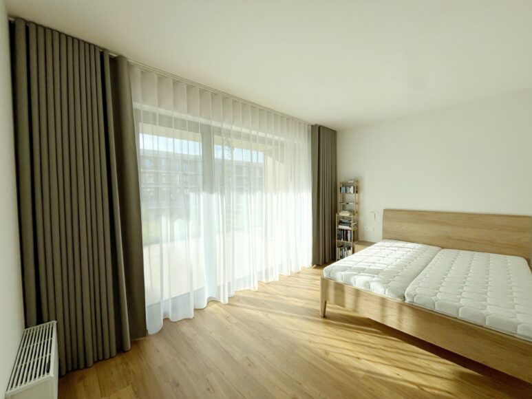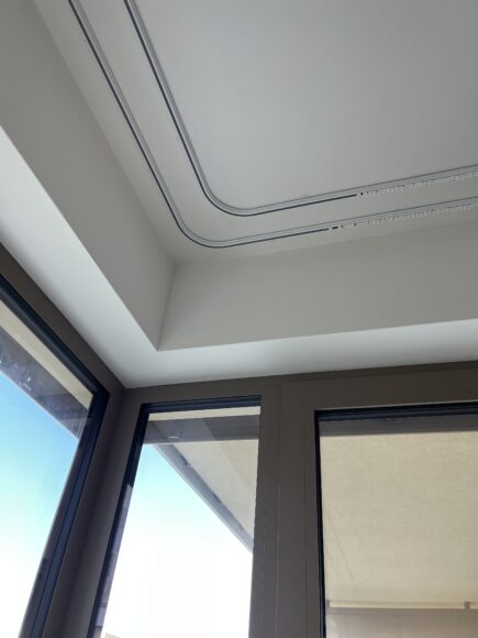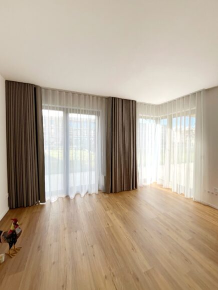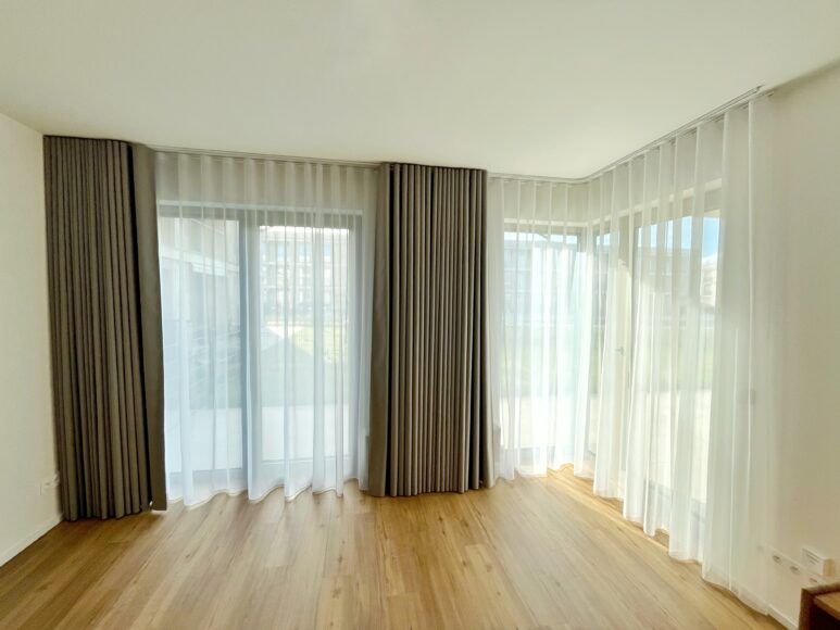 Rohové kolejnice Forest na míru s wave řasením. Závěsy jsme ušili z blackoutové látky, záclony jsou z bílého voálu.