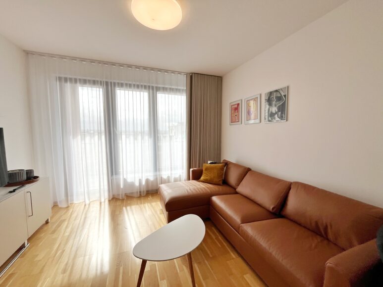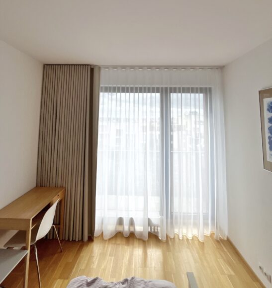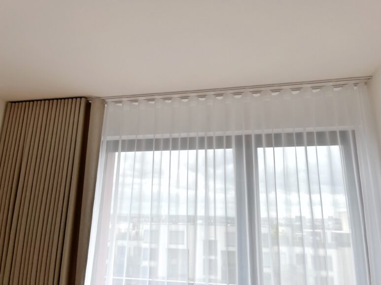 Kolejnice s wave systémem Forest. Dimoutové manchestrové závěsy a jemné záclony z voálu.