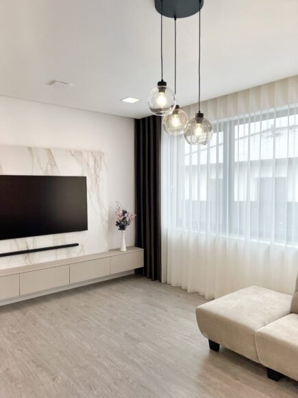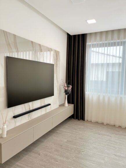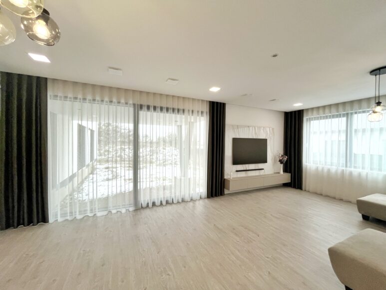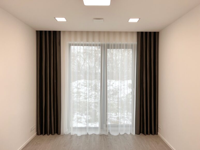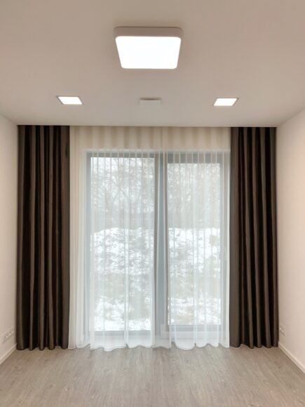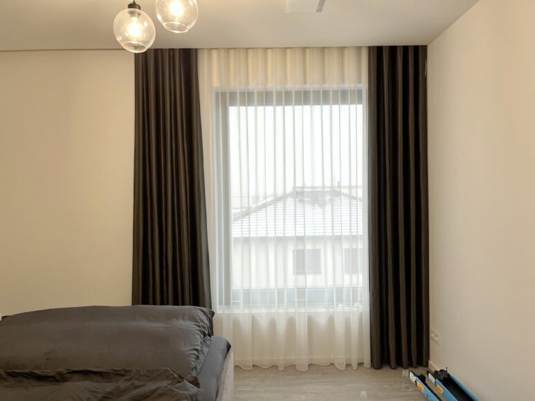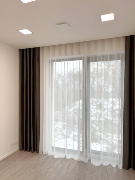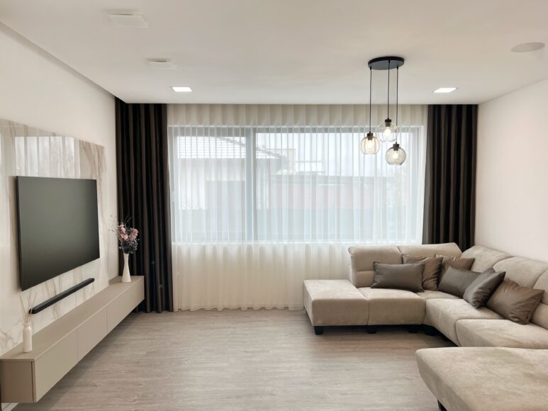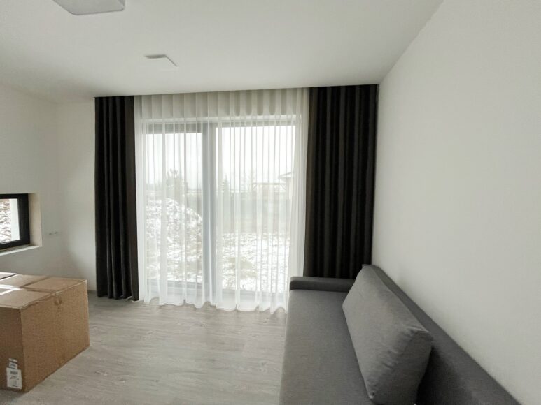 Kvalitní kolejnice Forest na míru do domu za Prahou. Závěsy v čokoládové barvě a krémové záclony s pravidelnou vlnou.