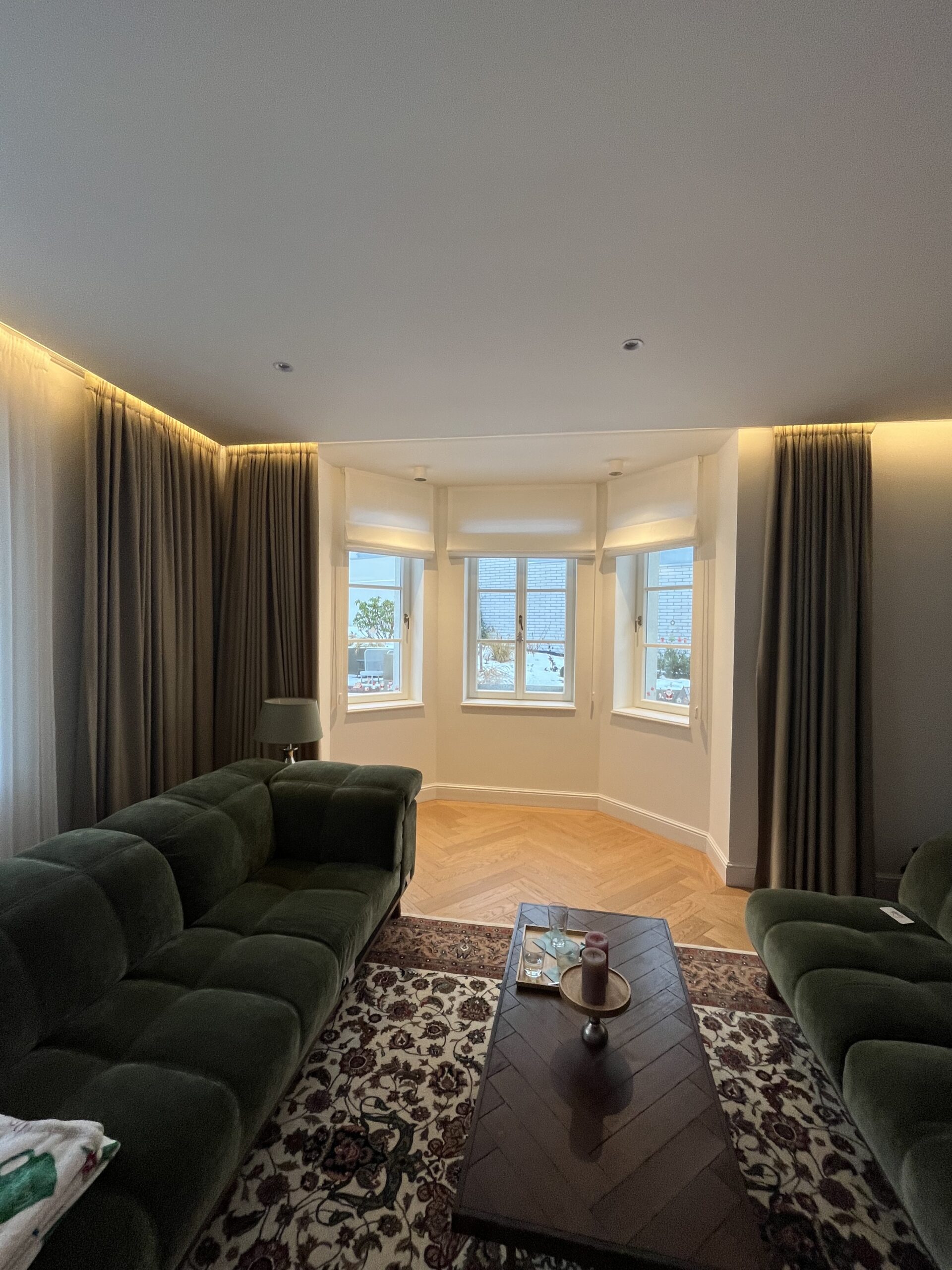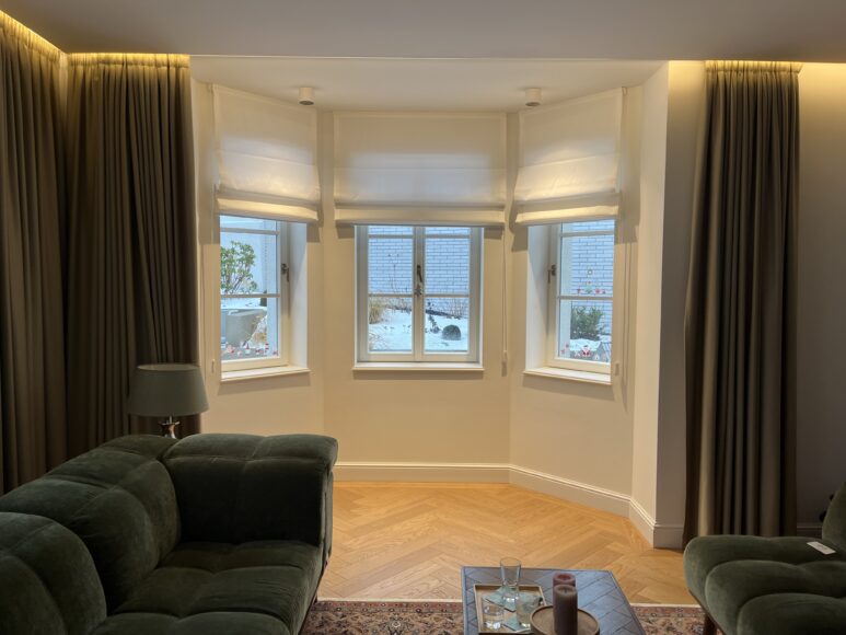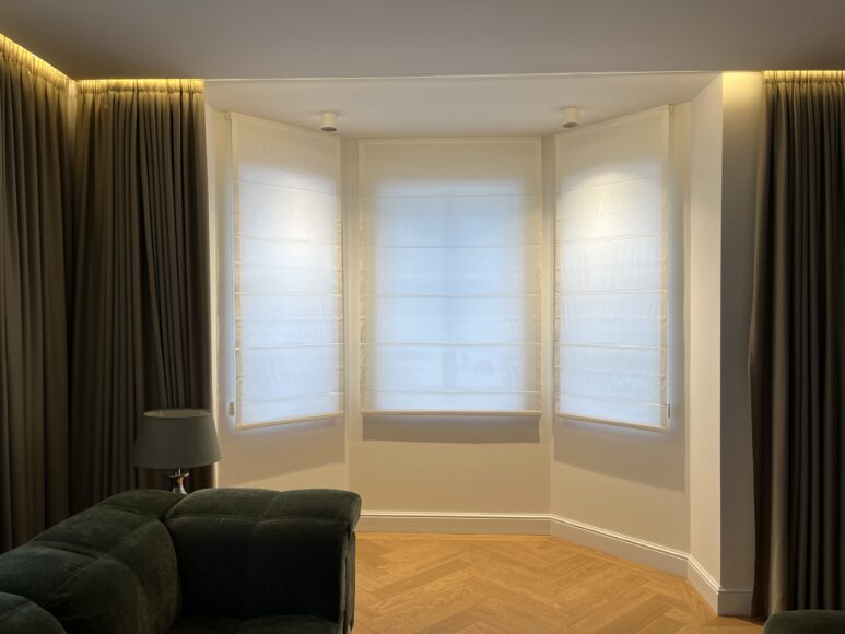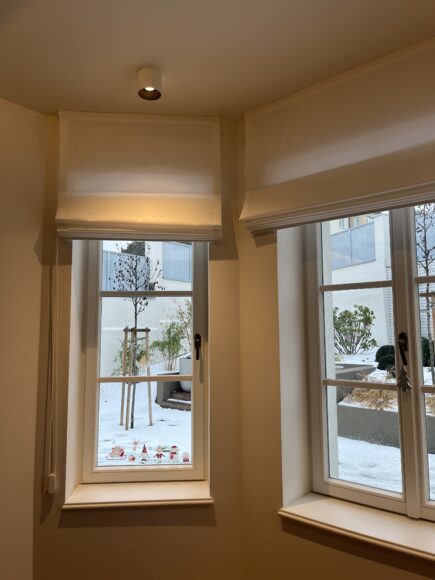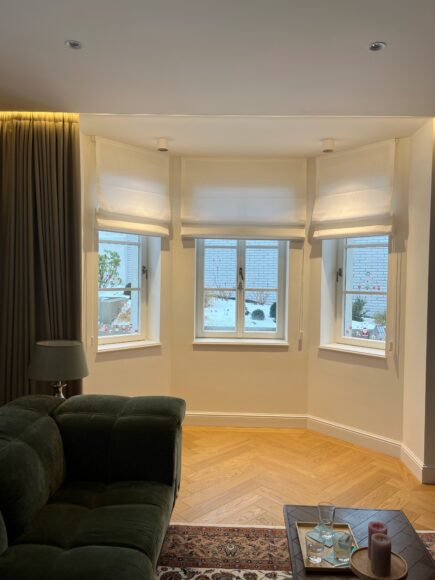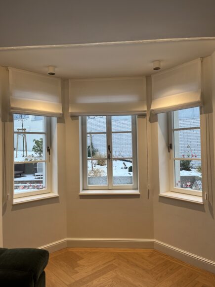 Na míru šité římské rolety s lehké látky s příměsí bavlny do atypického výklenku oken.